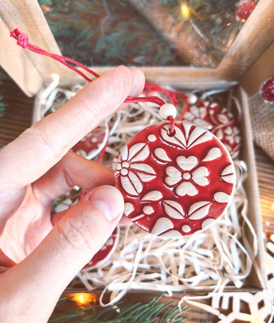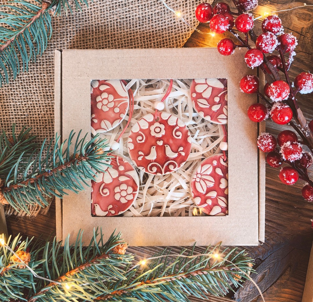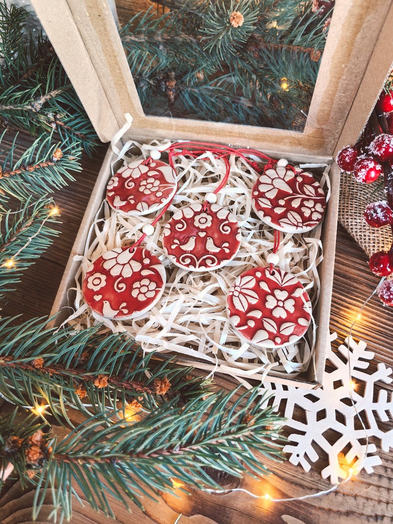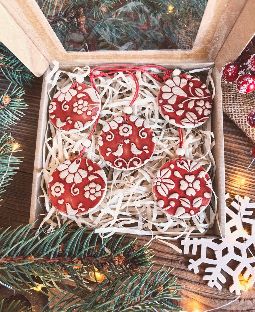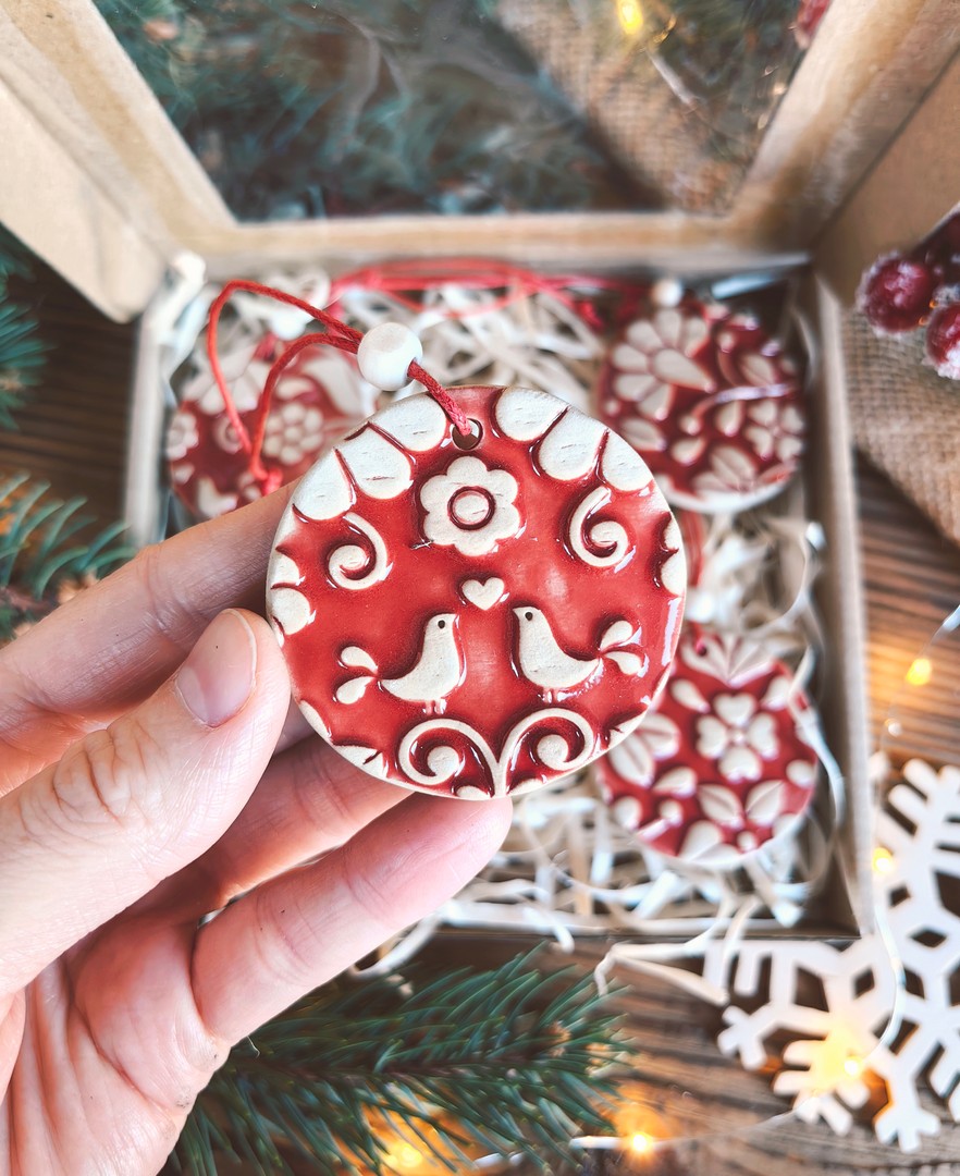 Ręcznie robione ceramiczne zawieszki na choinkę z folkowym motywem florystycznym. Są również urocze zakochane ptaszki w stylu skandynawskim. Wszyscy wielbiciele hygge! To z myślą o Was ; )